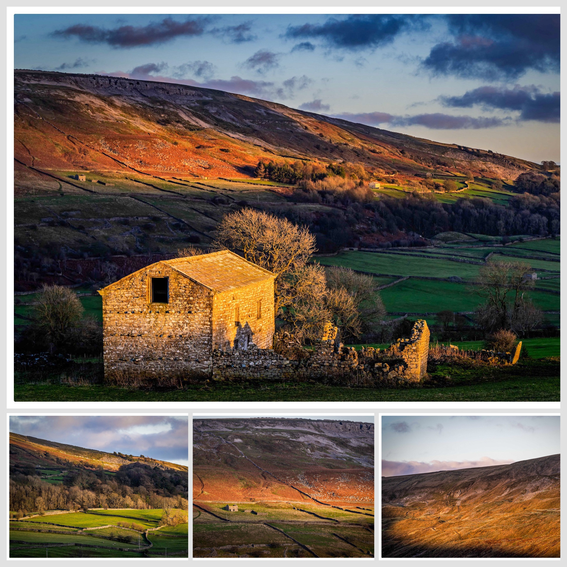 As it did, the familiar shapes of Swaledale changed. Stone barns that normally sit quietly in the landscape suddenly caught the glow, their rough walls turning gold against the darker slopes behind. The patchwork of fields, edged by dry stone walls, became more defined as the shadows lengthened and the light picked out every fold in the land.