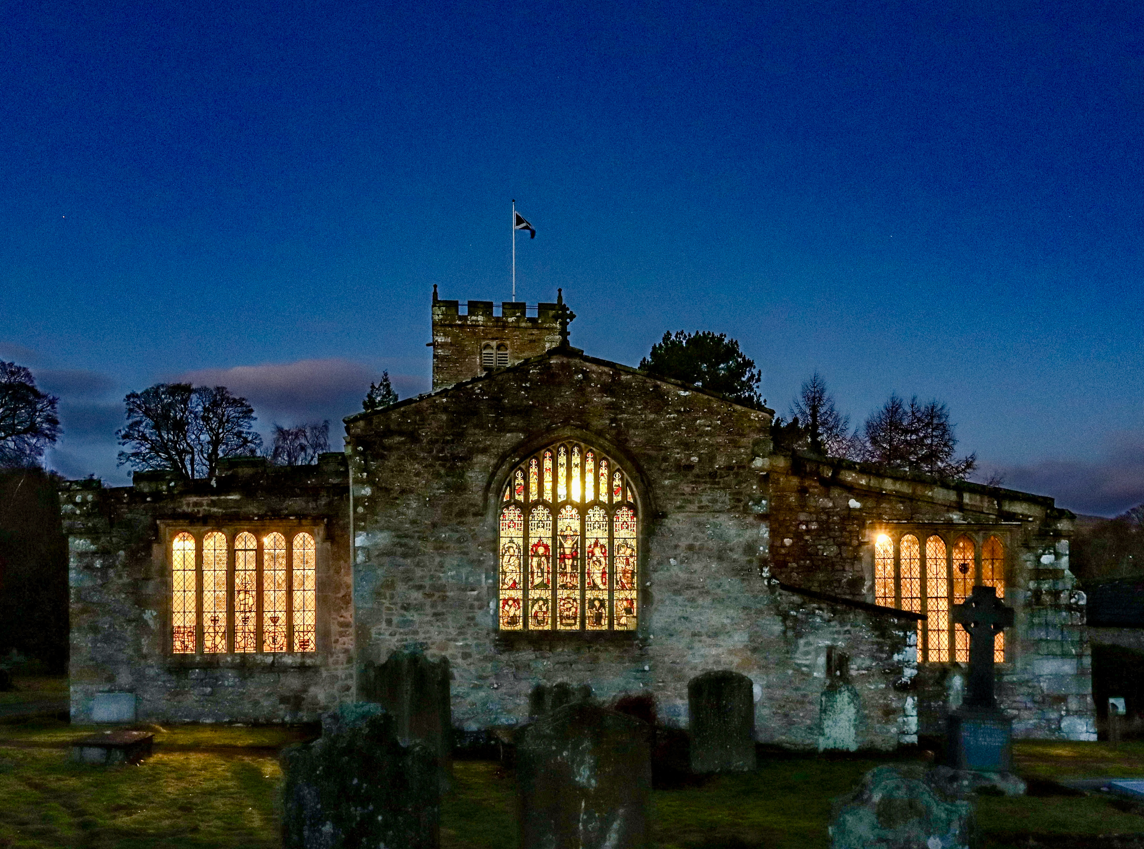 Even before I reached the churchyard I could see the warm glow of the stained glass windows spilling out into the fading blue of night. St Andrews which many people call the Cathedral of the Dales has a way of announcing itself quietly. It does not need dramatic skies or perfect conditions. Its presence alone carries centuries of stories and community spirit.