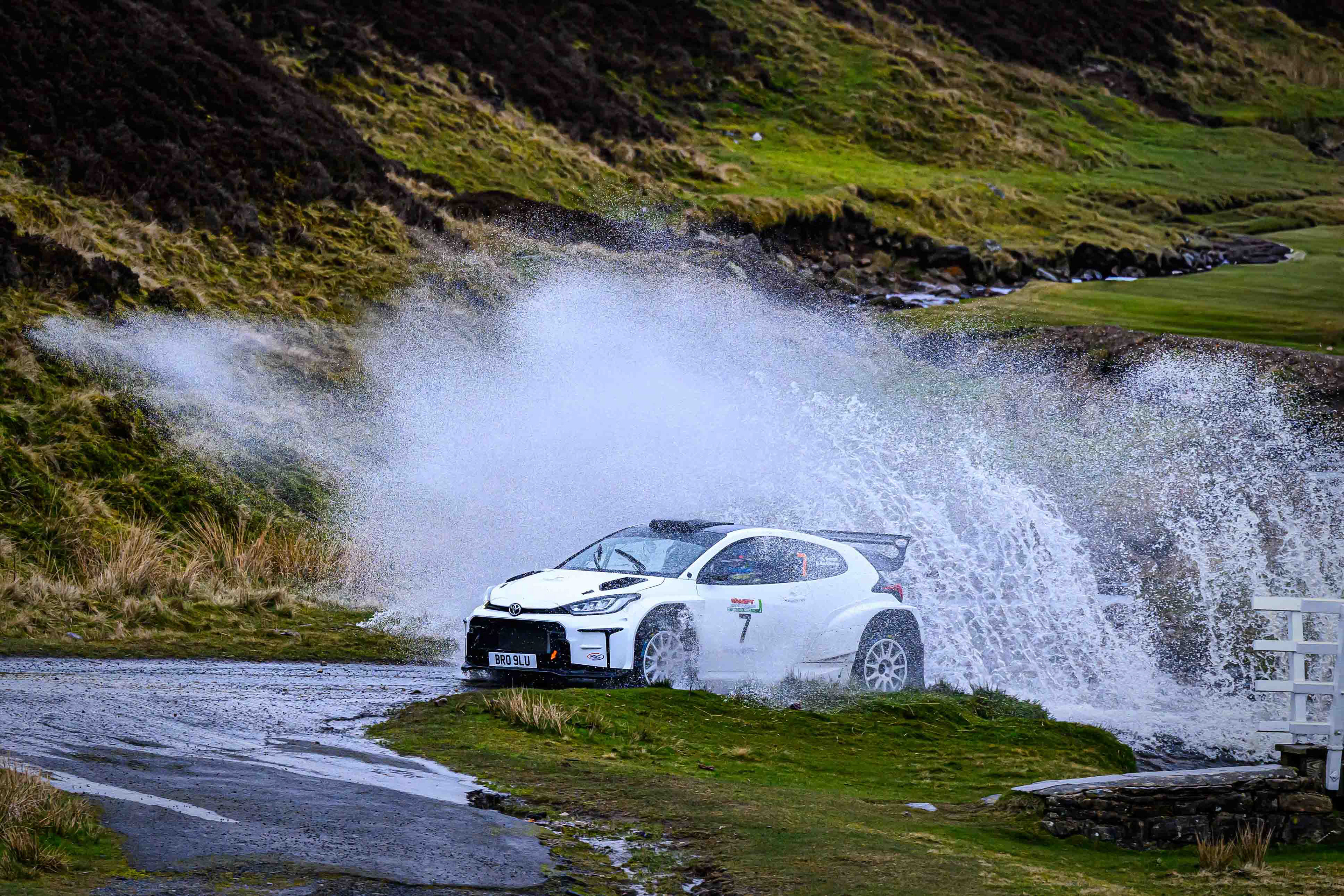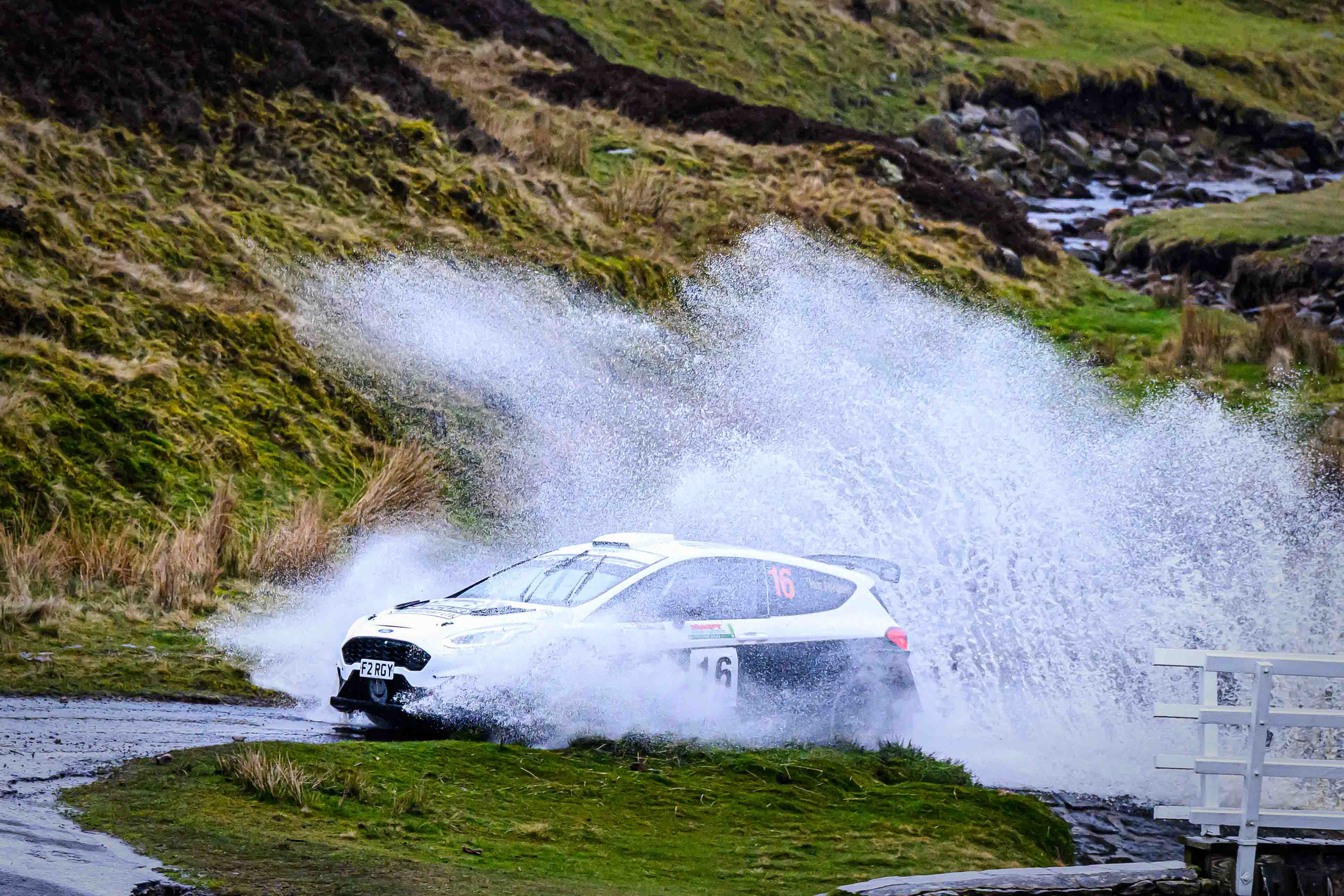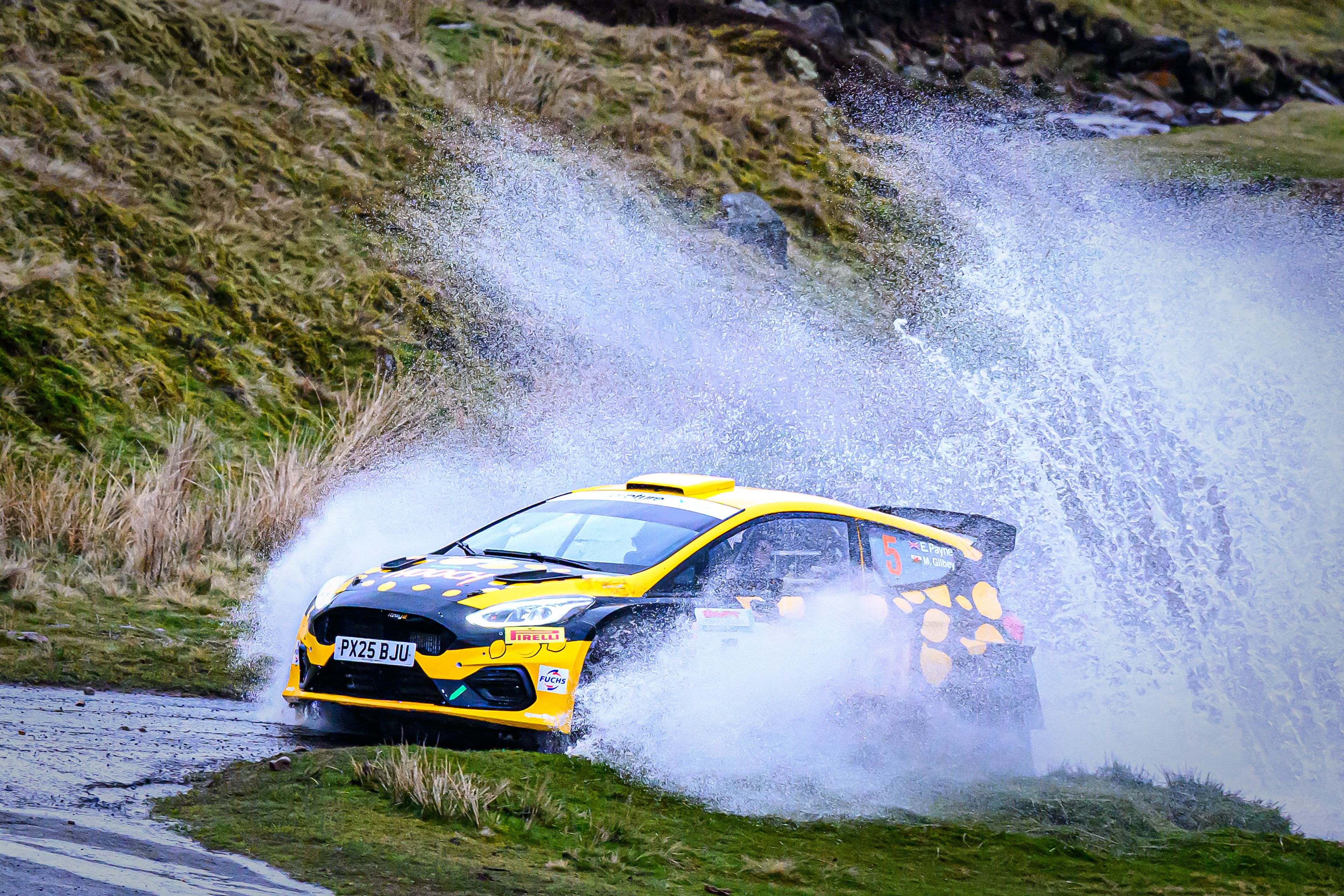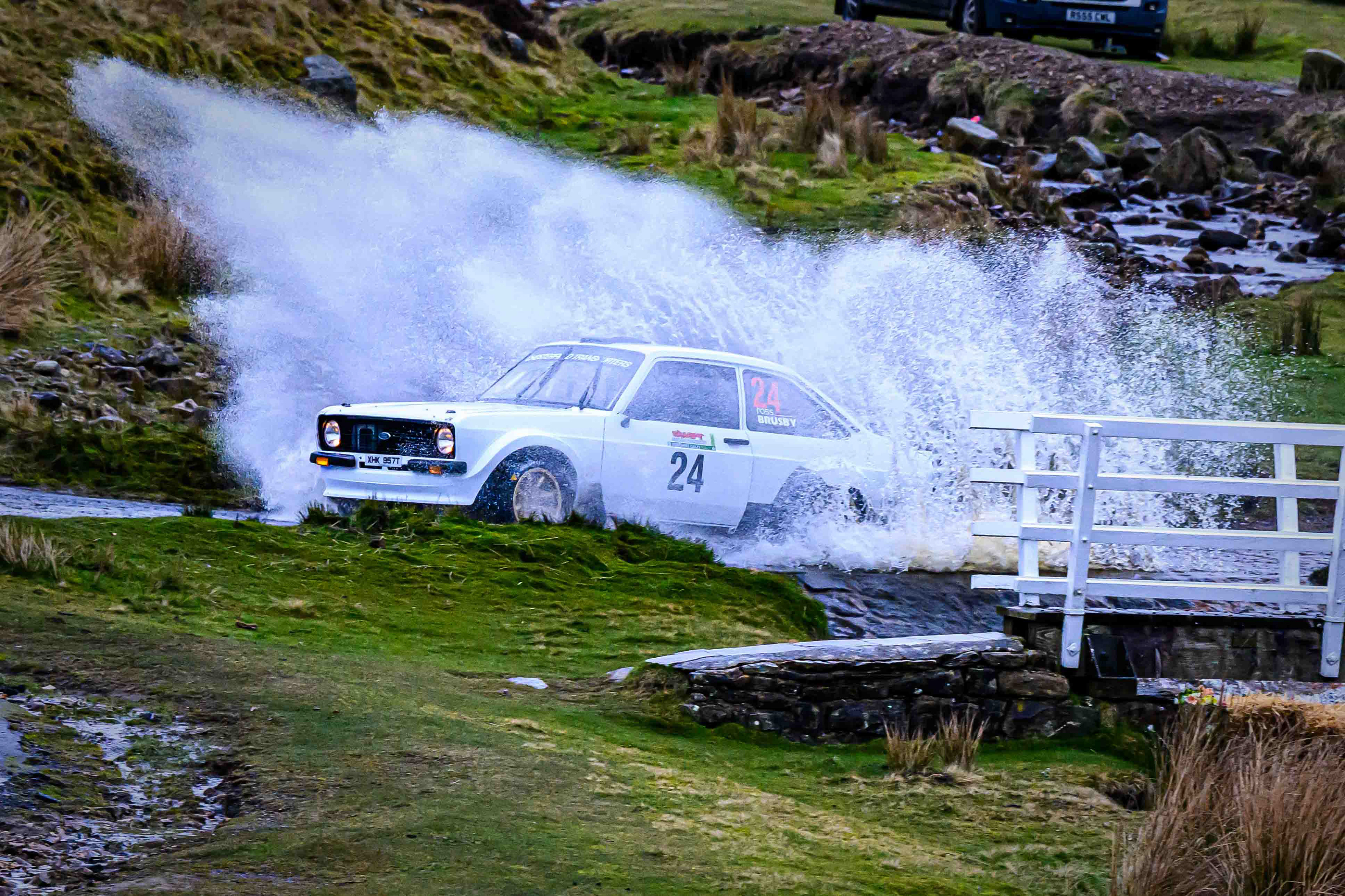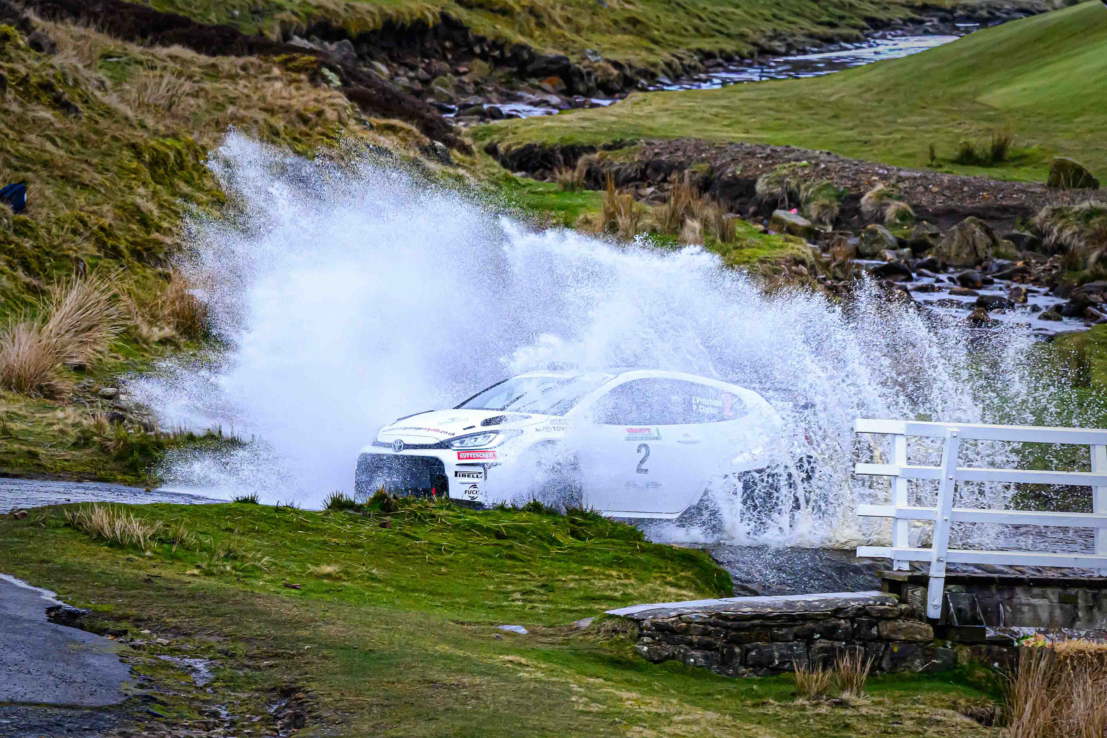 You hear it long before you see it: a rising note, a shift in tone, the unmistakable urgency of a rally car being driven with intent. When it burst into view and hit the watersplash, the whole scene changed. A sheet of spray lifted into the air, the sound cracked across the valley, and suddenly the Dales weren’t just watching — they were part of it.