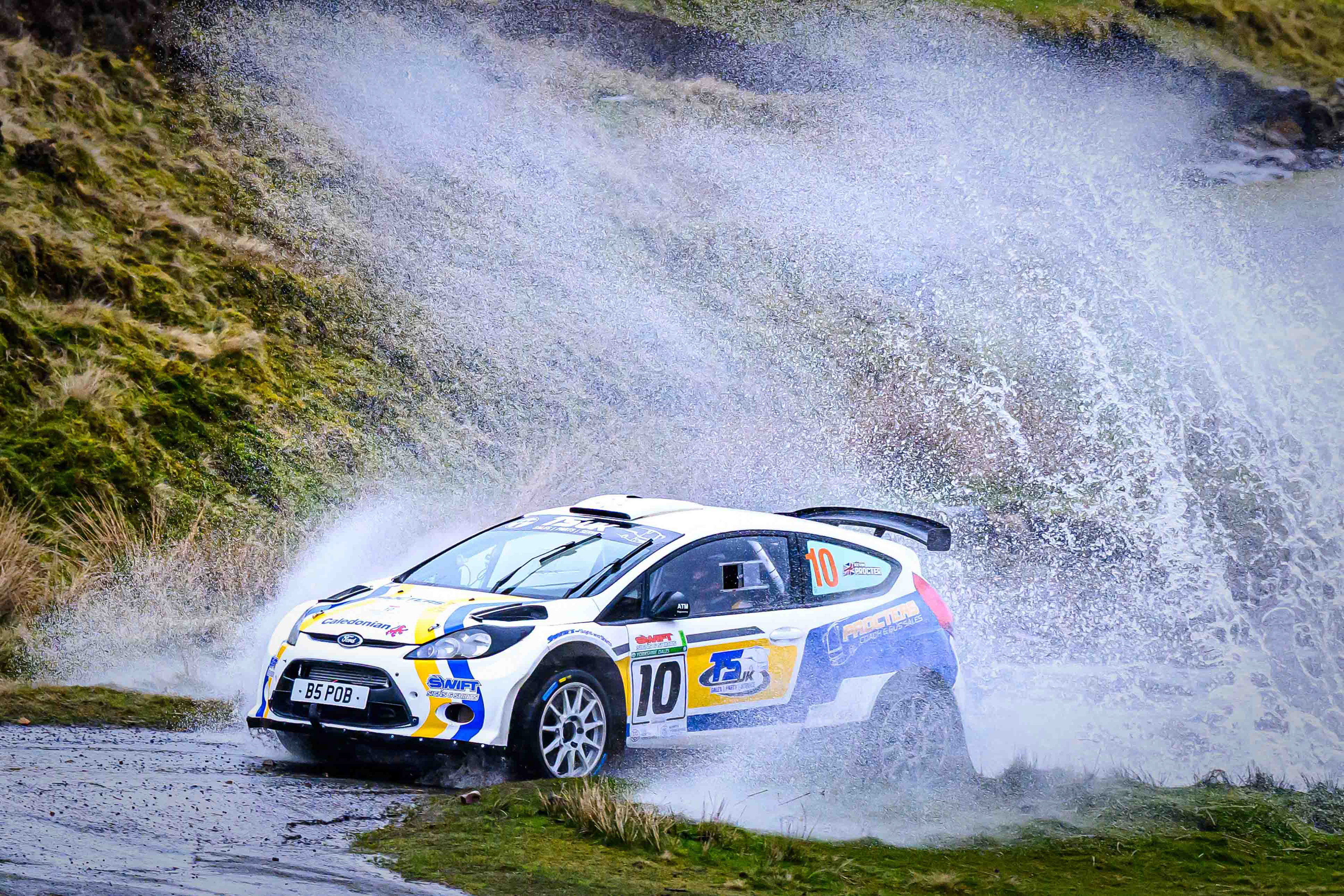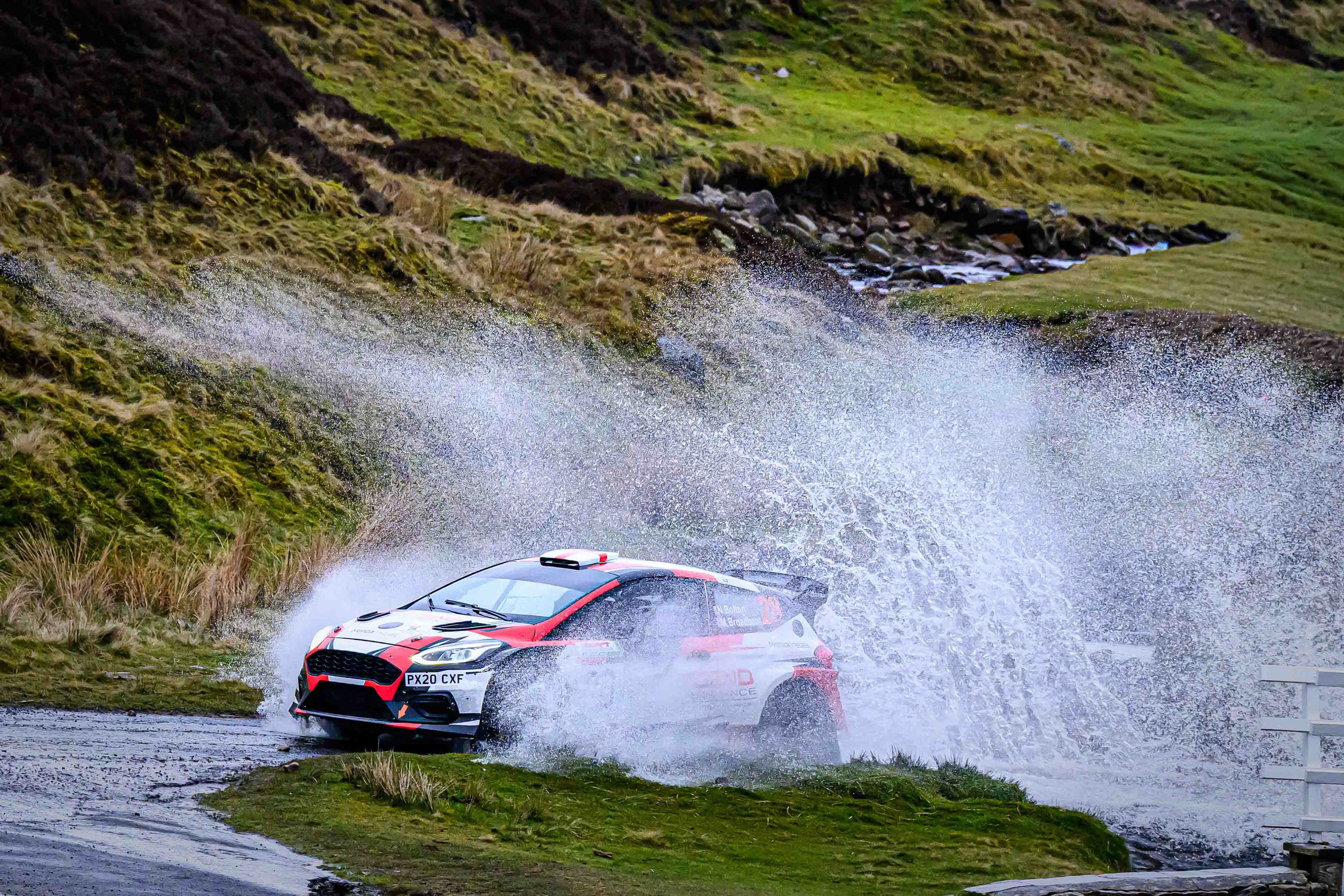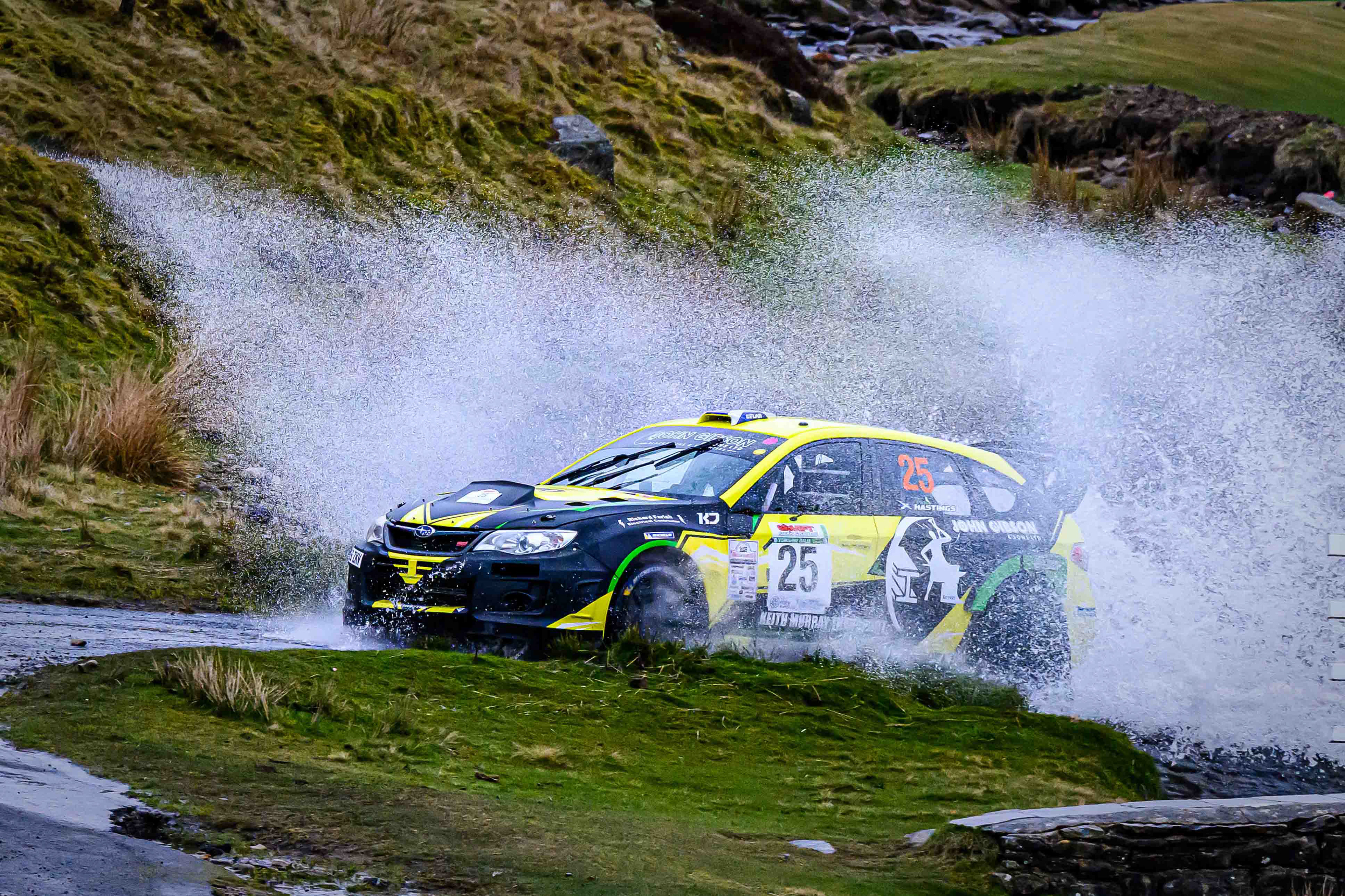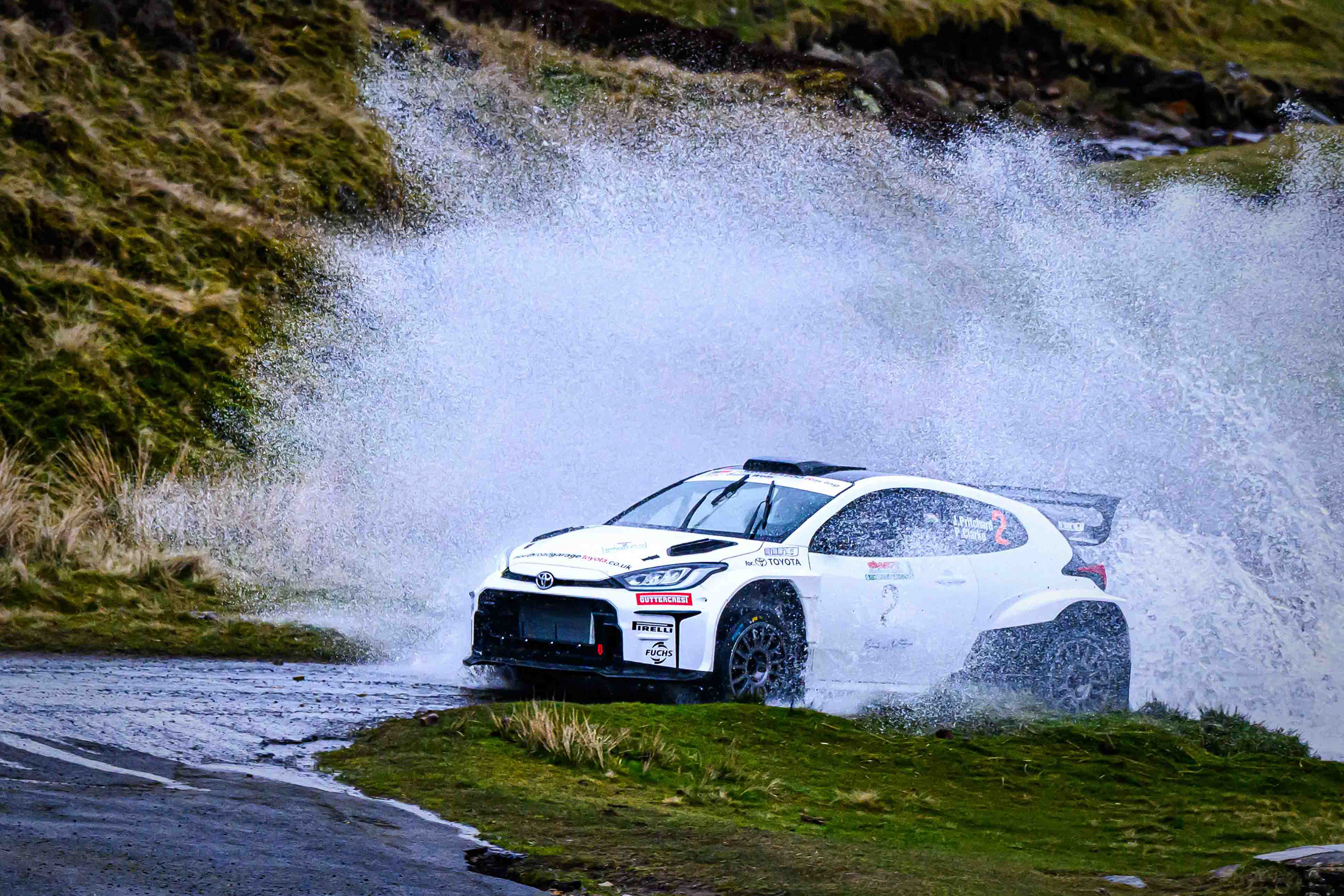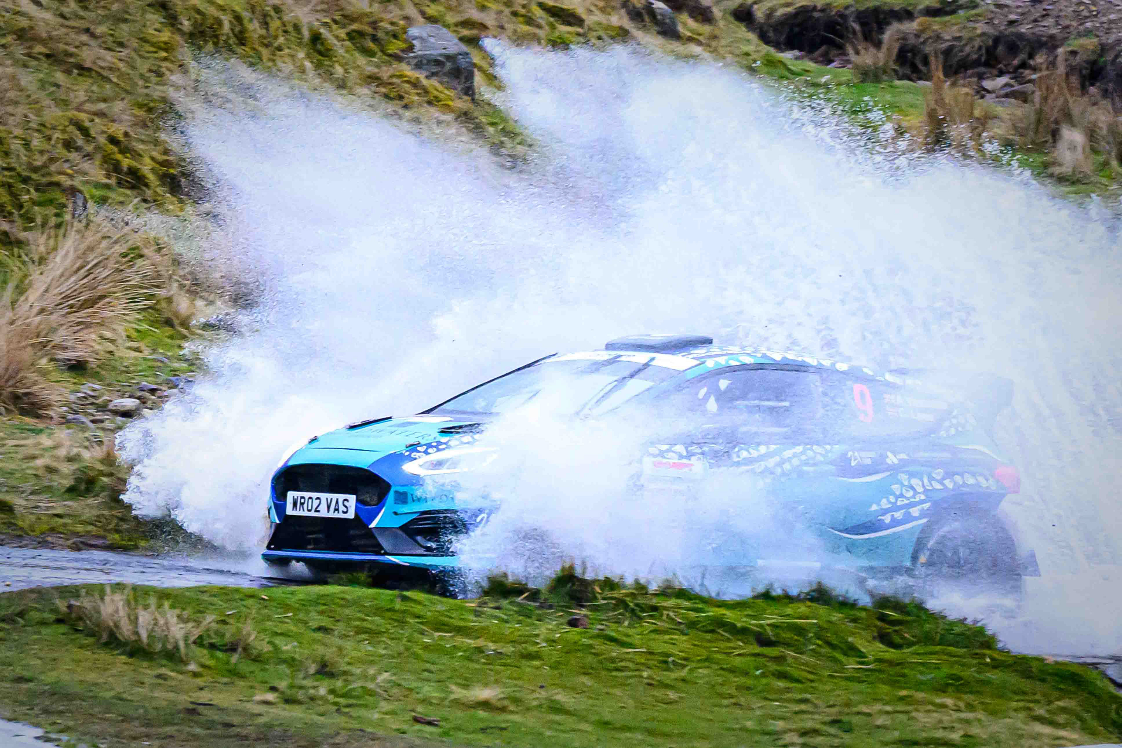You hear it long before you see it: a rising note, a shift in tone, the unmistakable urgency of a rally car being driven with intent. When it burst into view and hit the watersplash, the whole scene changed. A sheet of spray lifted into the air, the sound cracked across the valley, and suddenly the Dales weren’t just watching — they were part of it.