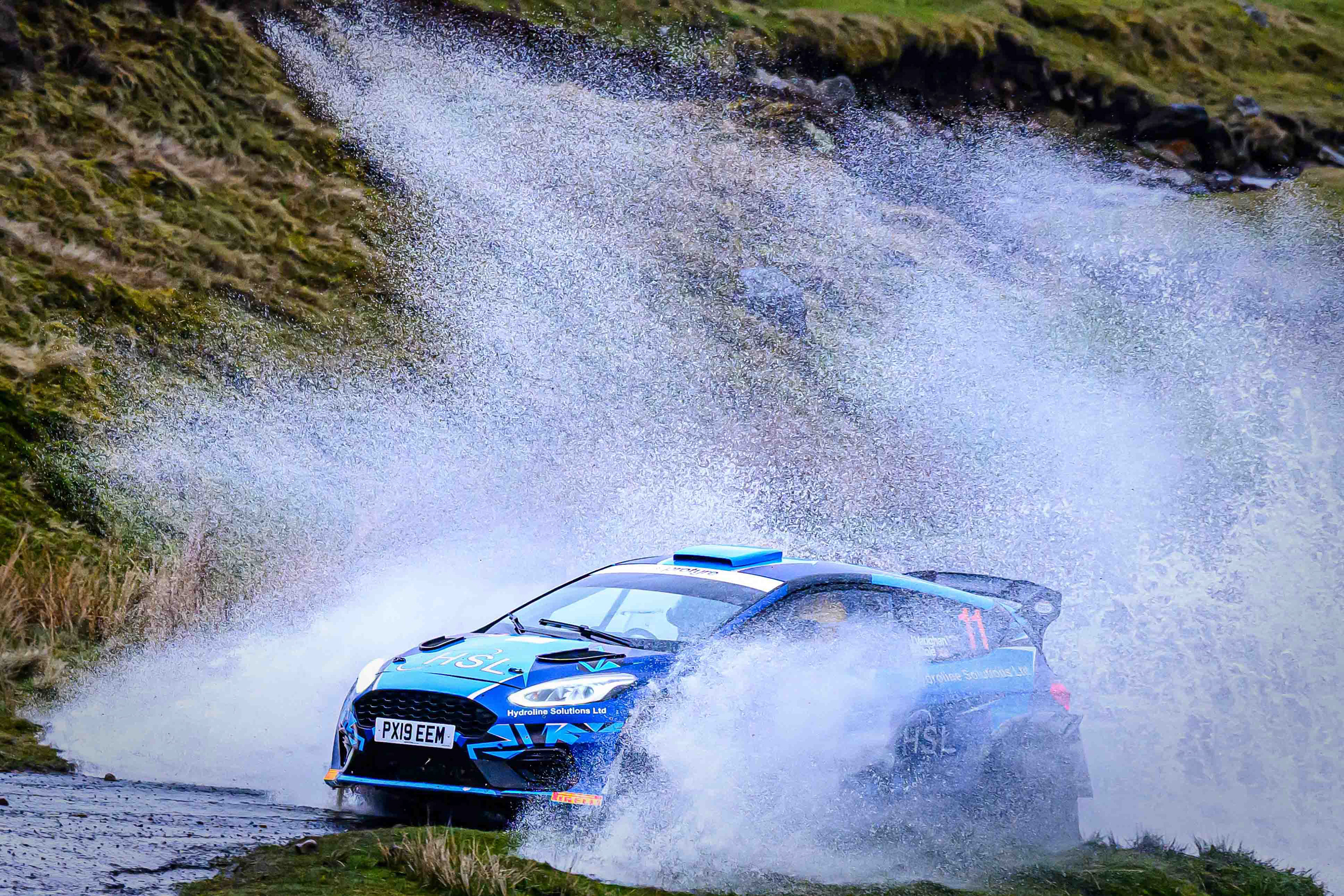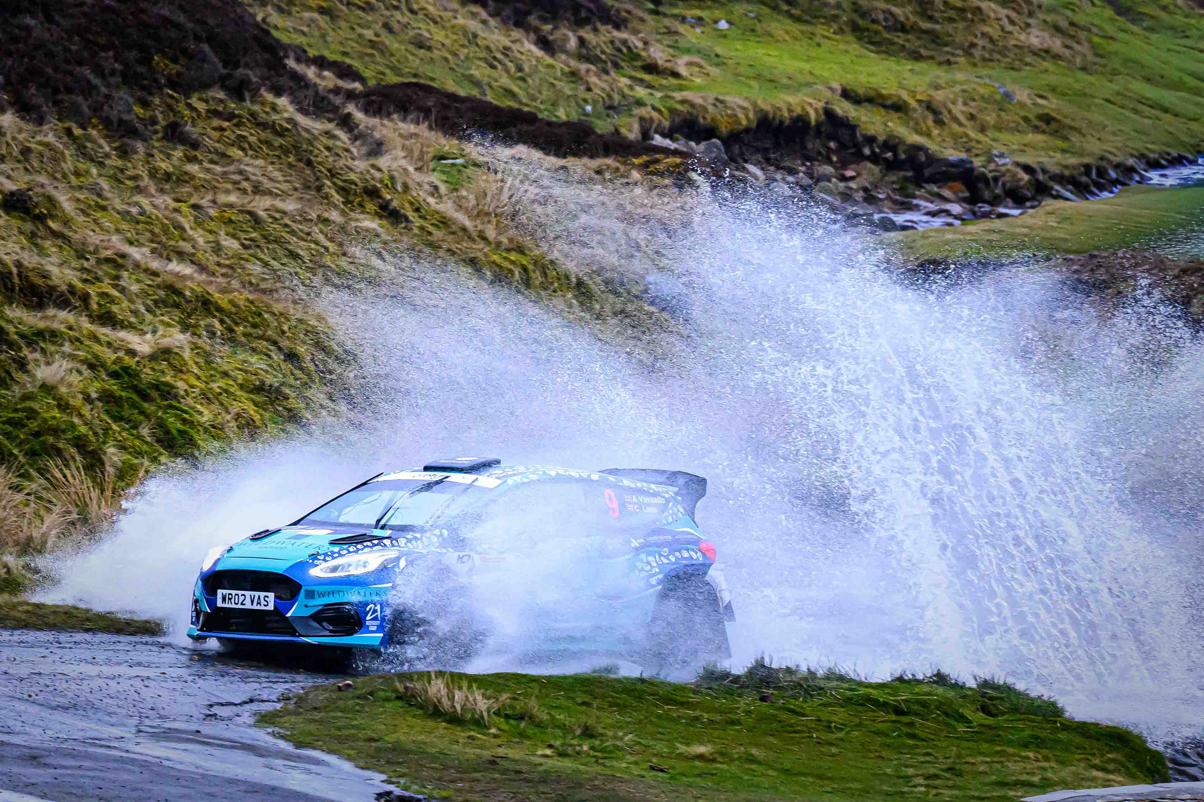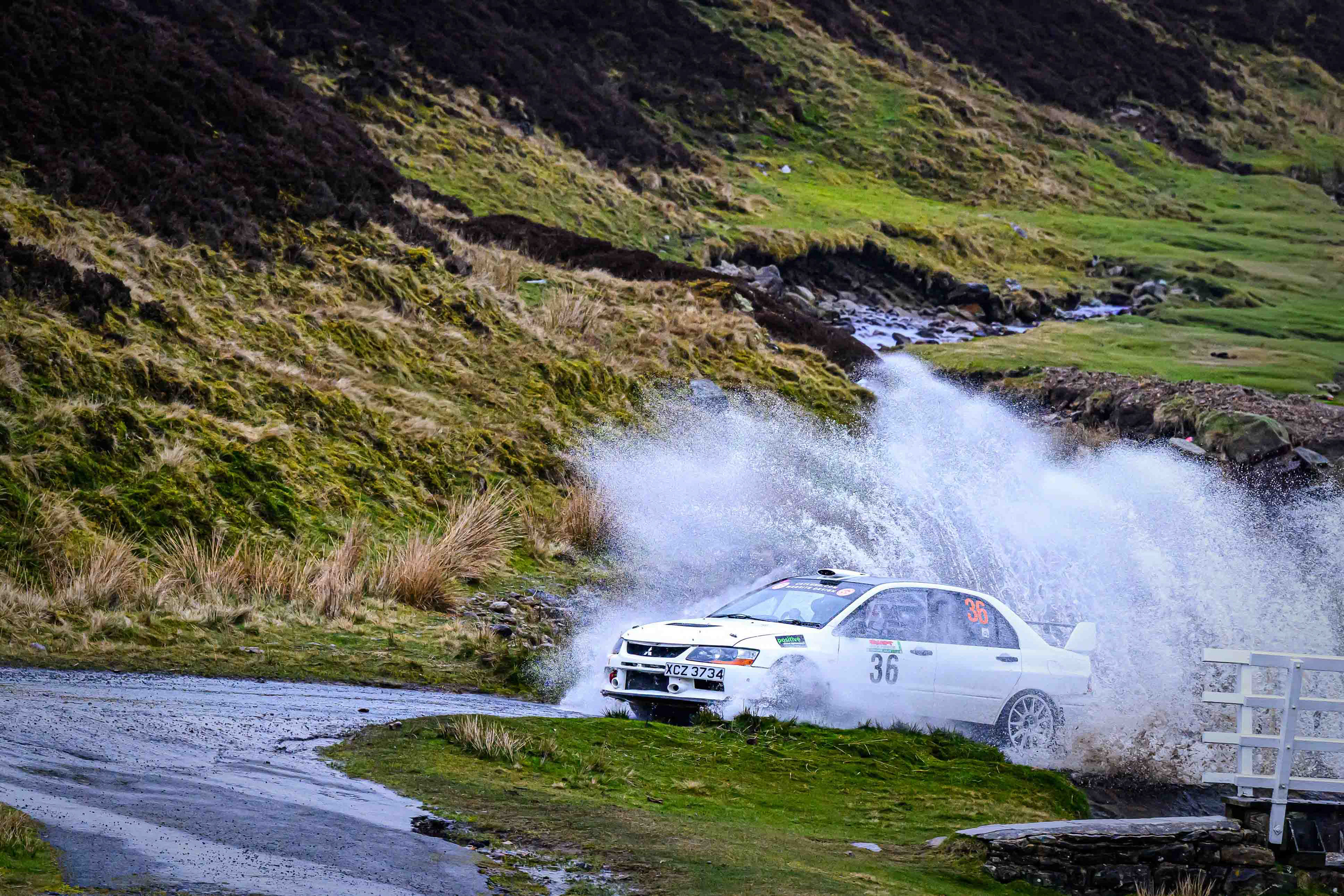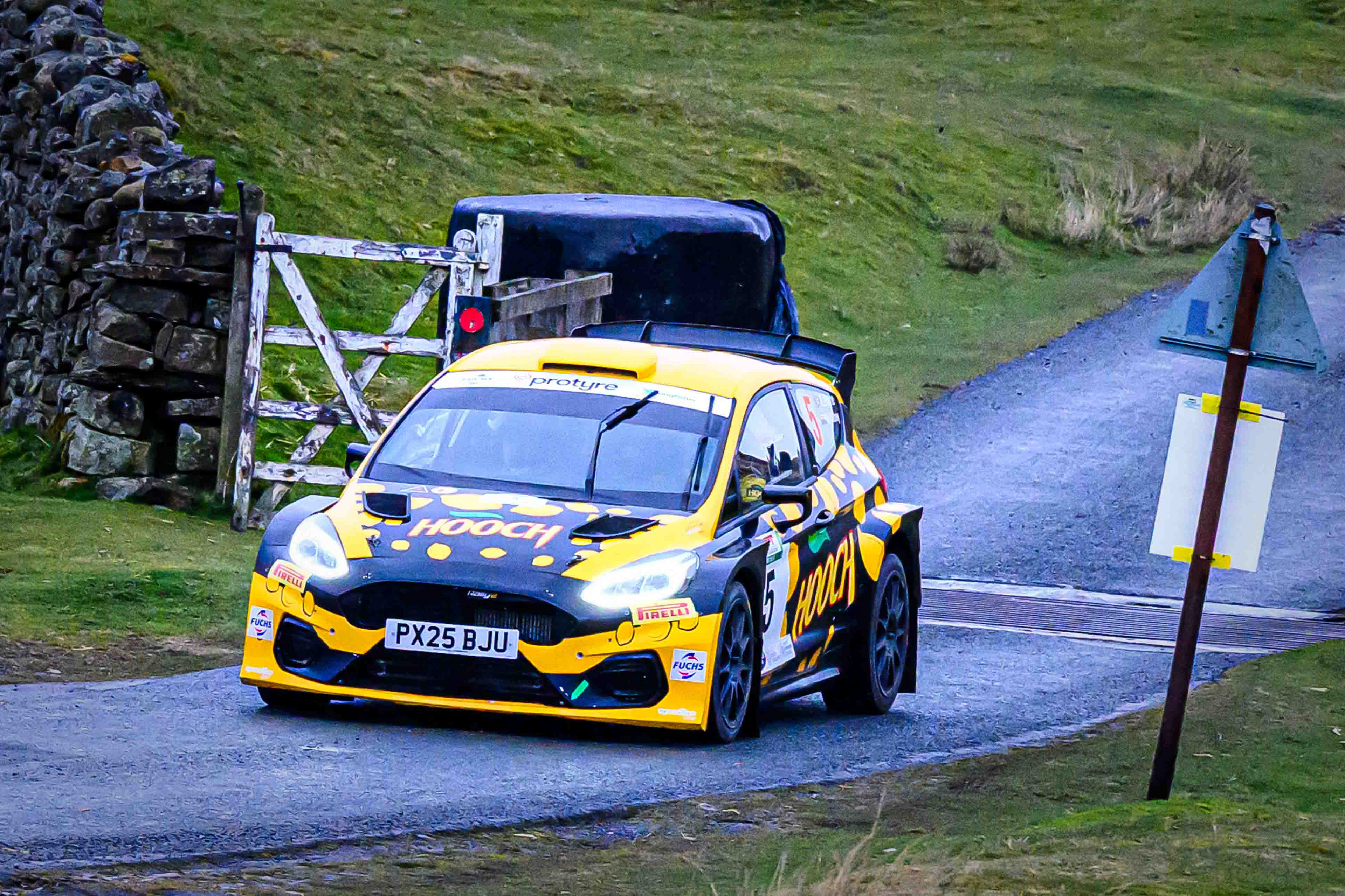 You hear it long before you see it: a rising note, a shift in tone, the unmistakable urgency of a rally car being driven with intent. When it burst into view and hit the watersplash, the whole scene changed. A sheet of spray lifted into the air, the sound cracked across the valley, and suddenly the Dales weren’t just watching — they were part of it.