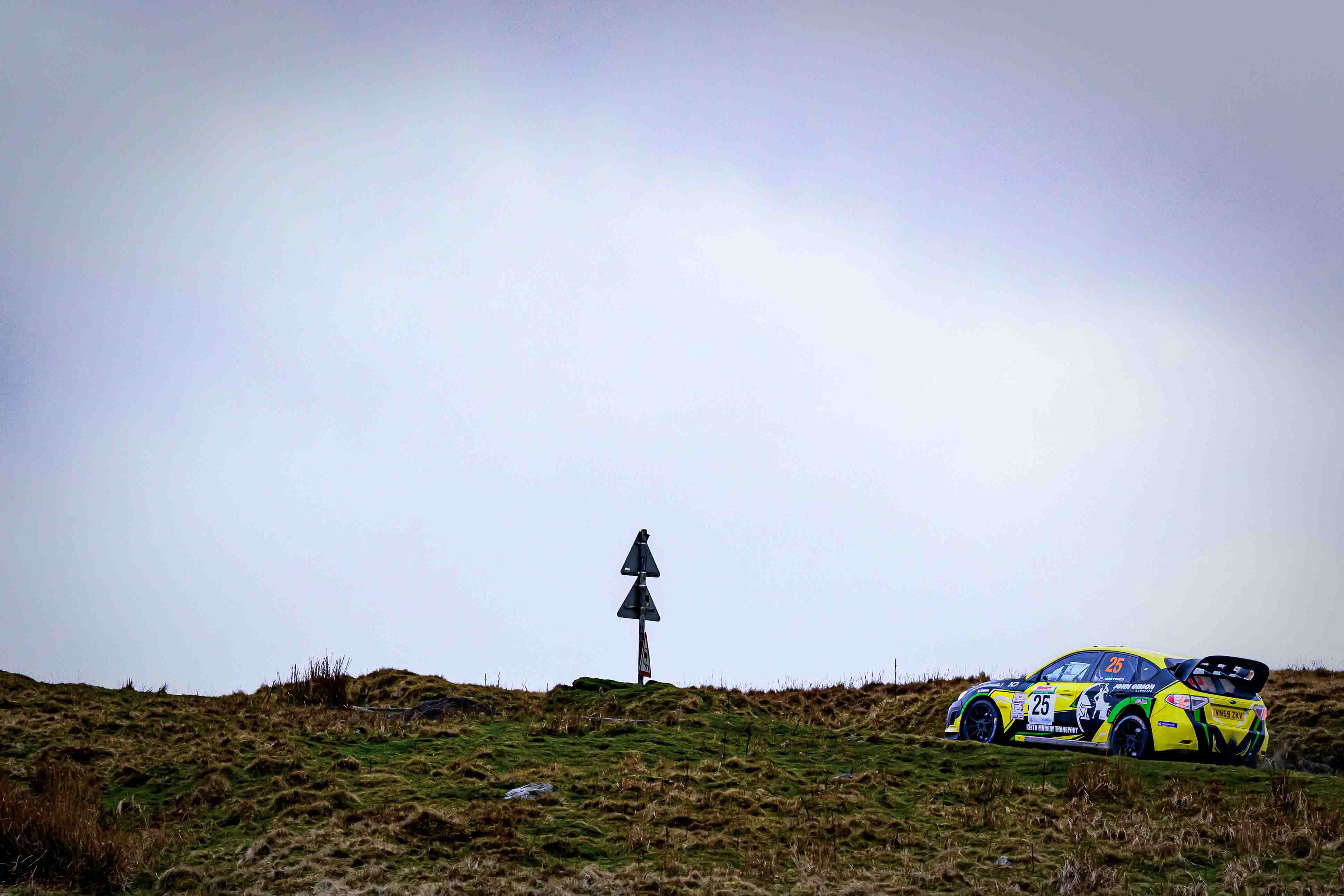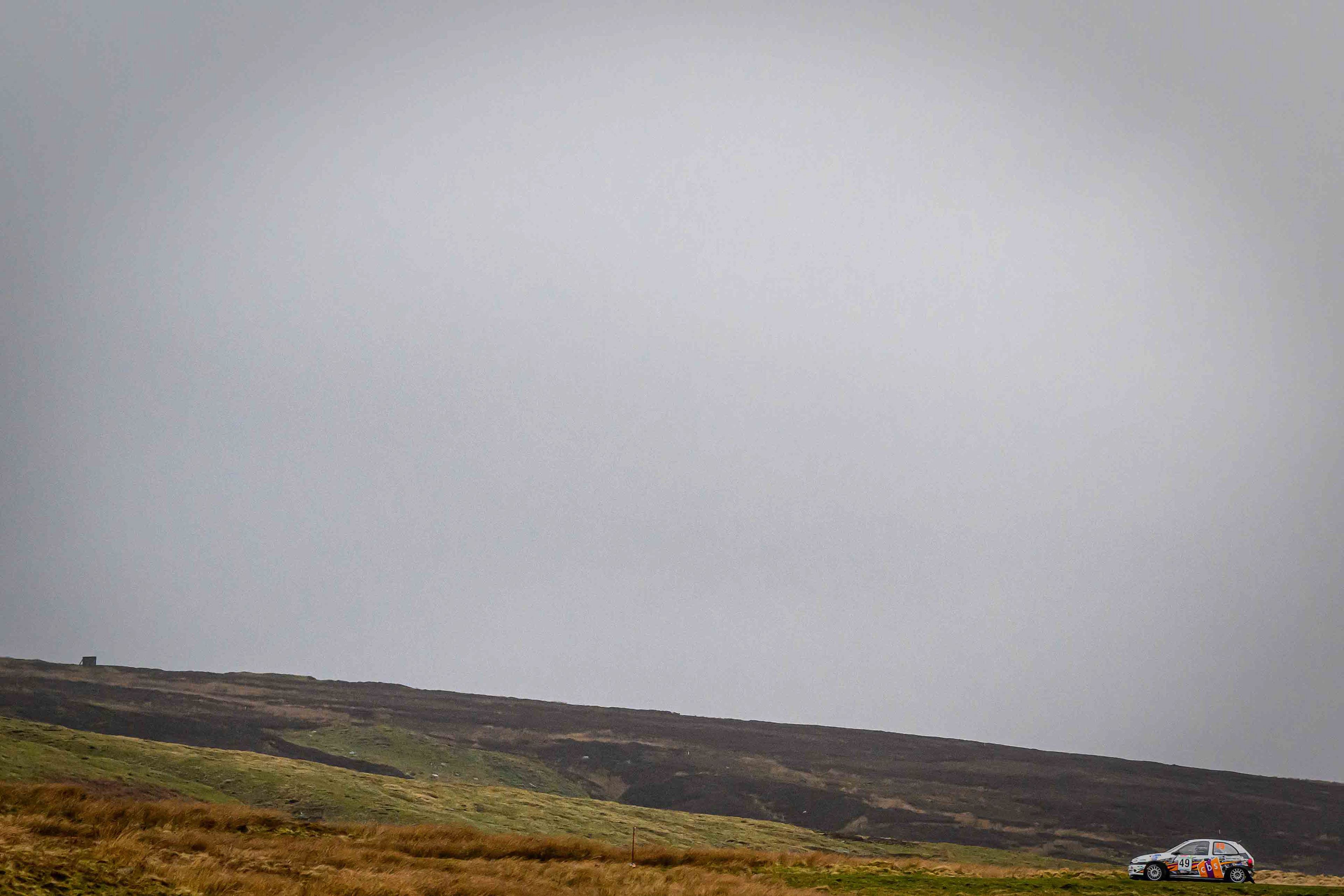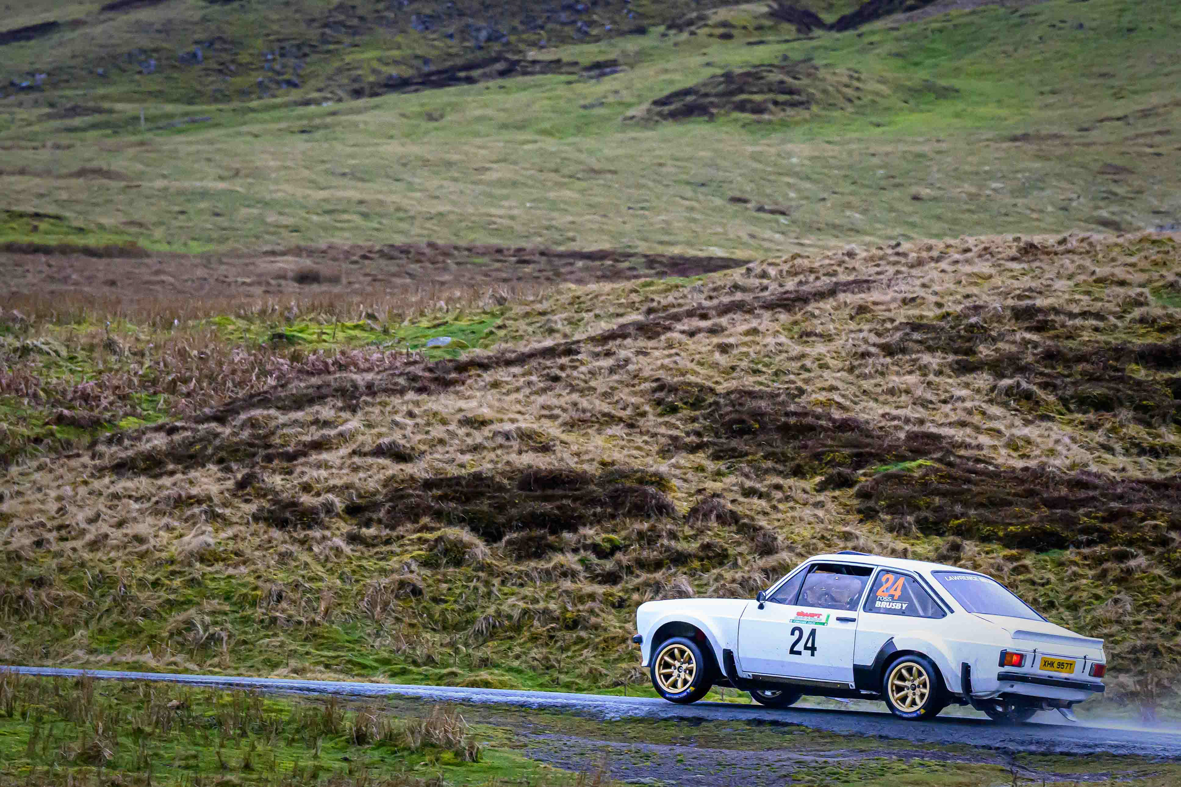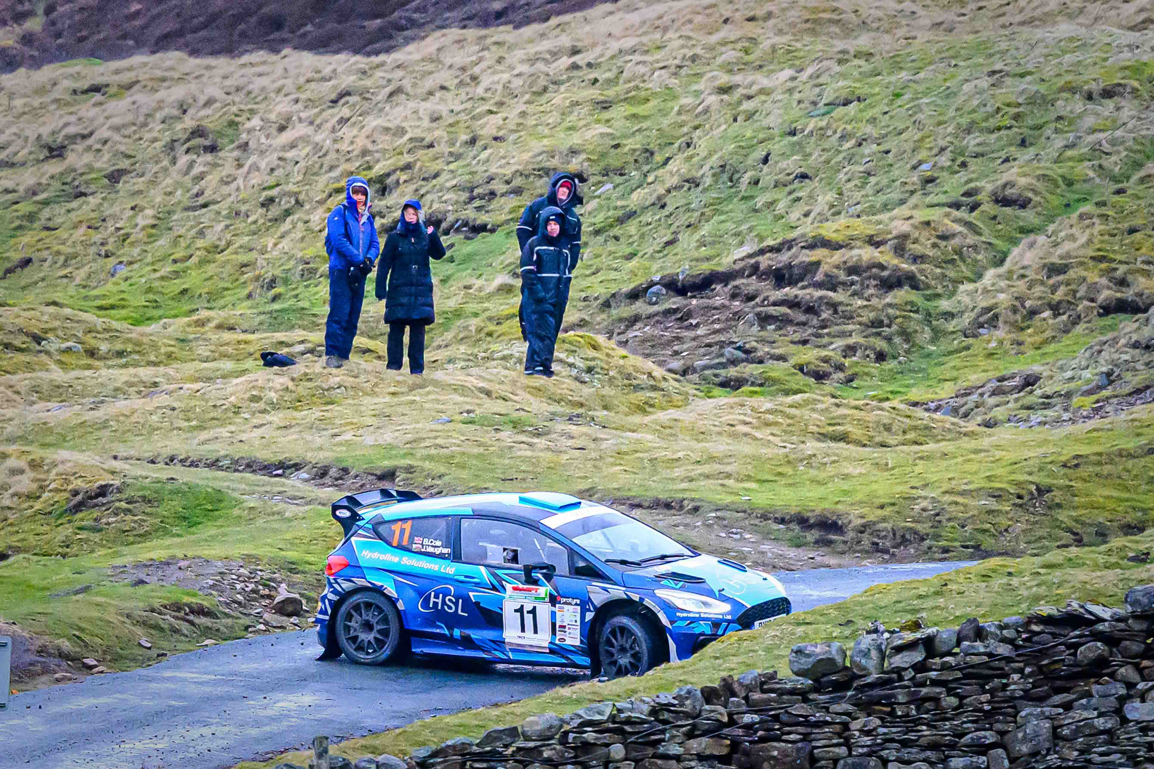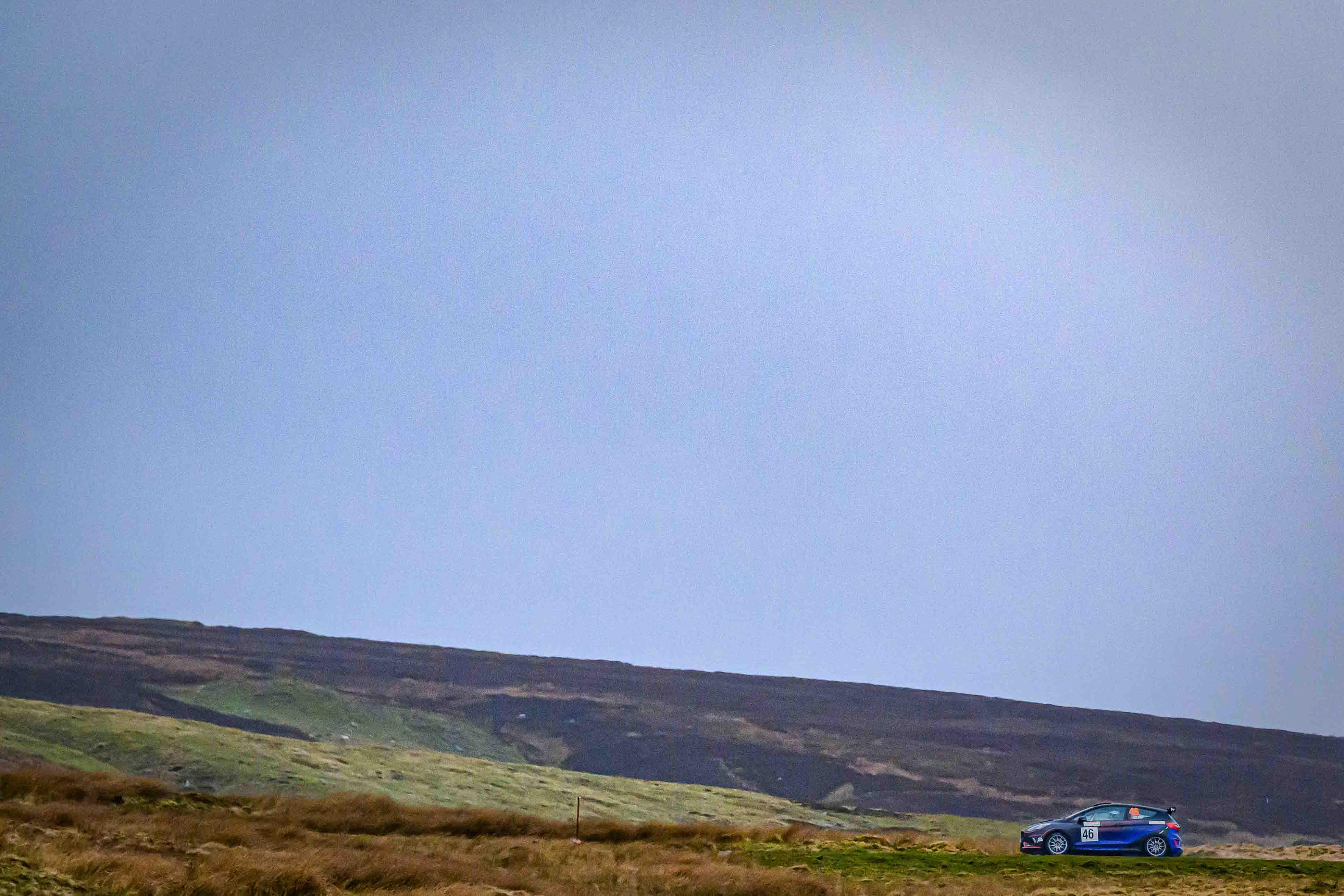 I headed out early to the watersplash just before the bridge, a spot that felt instantly right for a debut. The road dips into a shallow run of water, framed by rough grass, stone, and the open sweep of the moor. Even before the first car arrived, you could sense the stage waking up — the quiet shuffle of spectators finding their places, the cold air hanging still, the hills waiting to see what rallying would look like here.